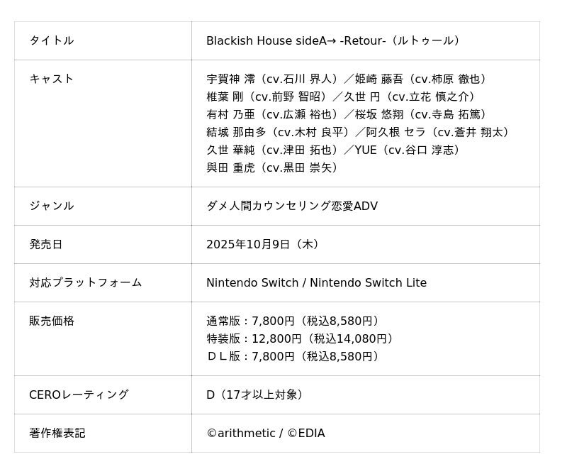 株式会社エディア(本社:東京都千代田区、代表取締役社長:賀島 義成、以下:エディア)は、株式会社アリスマティック(本社:東京都文京区、代表取締役:星 昌宏、以下:アリスマティック)よりライセンス許諾を受け、Nintendo Switch用ソフト『Blackish House sideA→ -Retour-』を本日2025年10月9日(木)に発売したことをお知らせいたします。