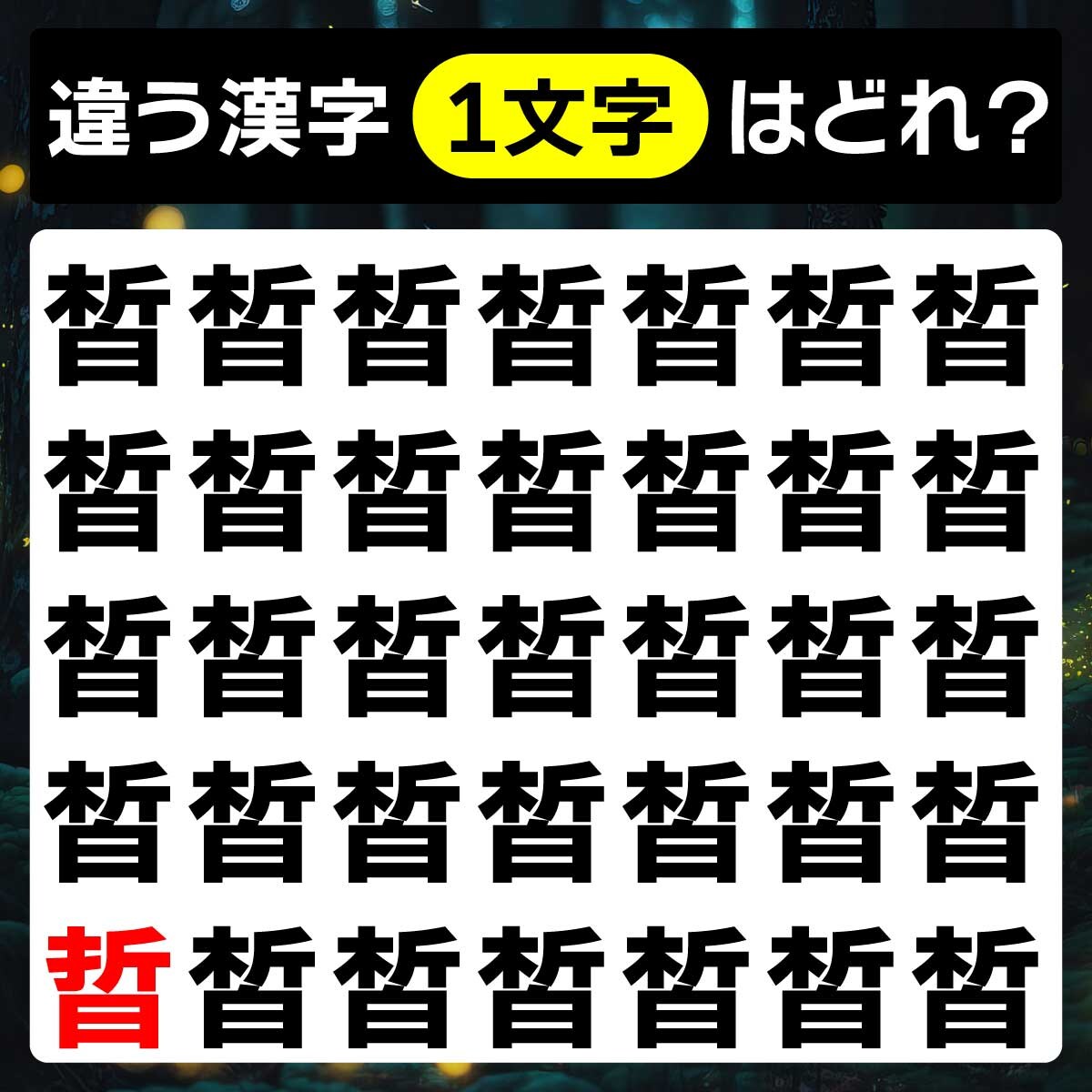 違う漢字は、一番下の列、一番左の文字でした!