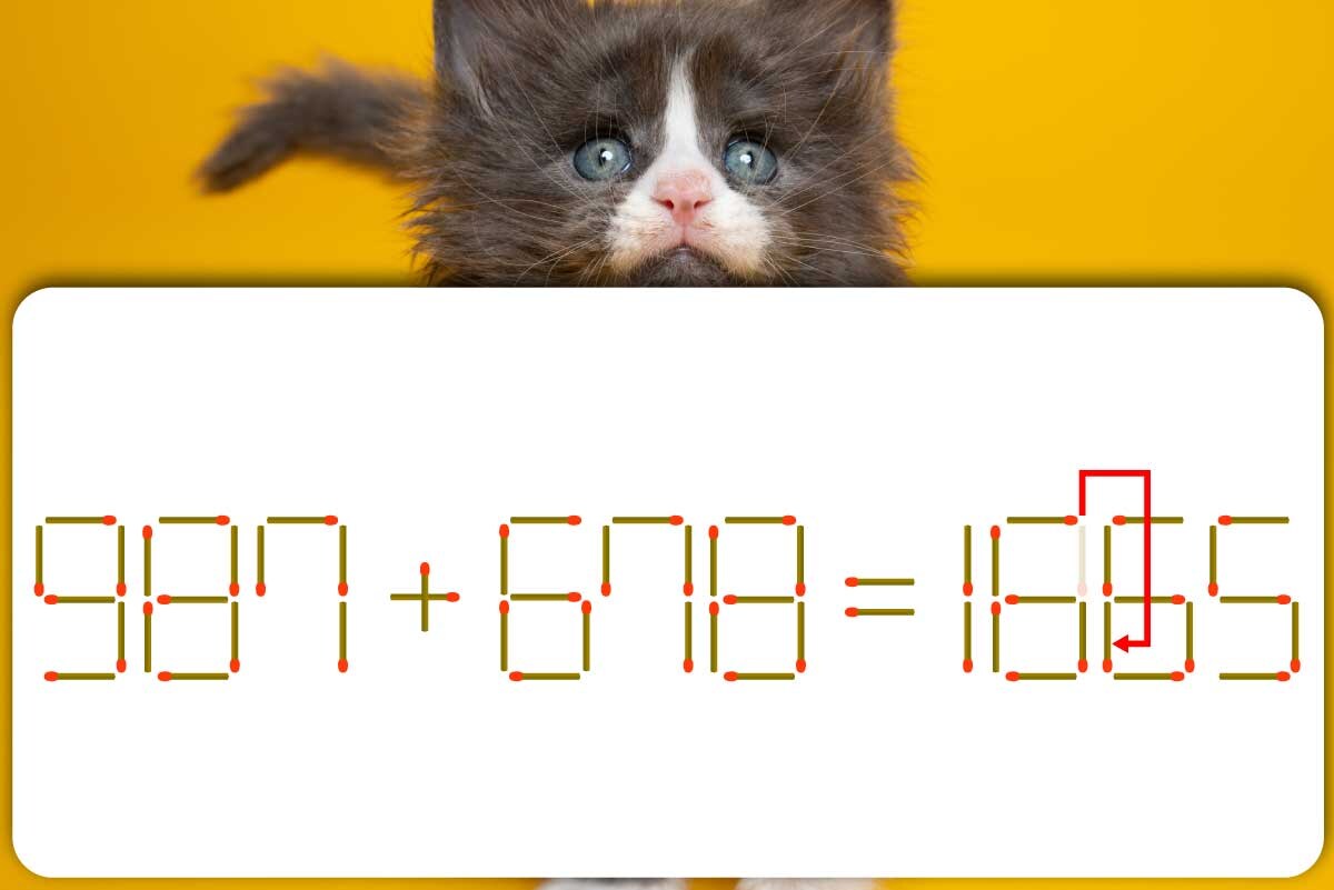 まずは「1855」の「8」に注目! 右上のマッチをとなりの「5」の左下に持っていきましょう。すると「987+678=1665」となり、正しい式に! ※解答は複数ある場合があります。