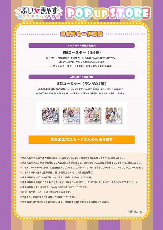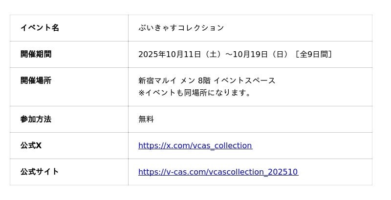 株式会社アイブレイド(本社:東京都板橋区 代表取締役:妻木 泰夫)が運営するVTuberキャスティングサービス「ぶいきゃす」(https://v-cas.com/)は、2025年10月11日(土)~10月19日(日)の9日間、新宿マルイ メンにてポップアップイベント「ぶいきゃすコレクション」を開催することをお知らせいたします。