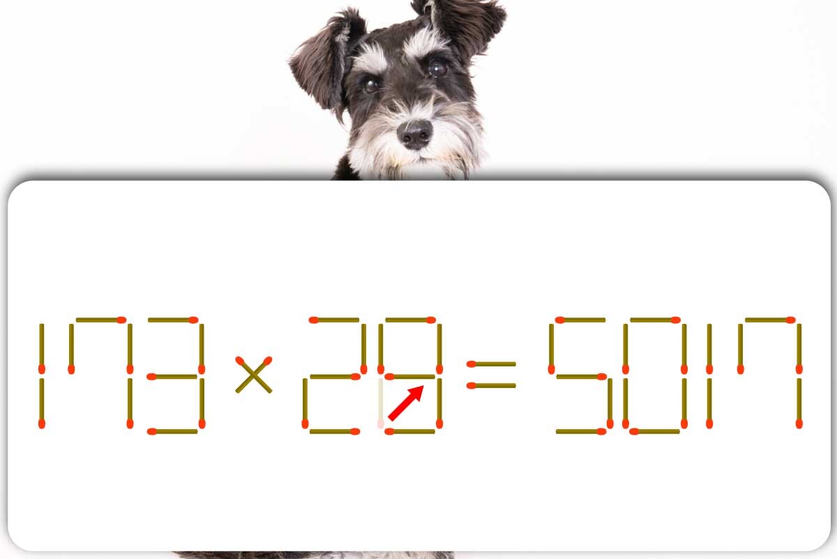 動かすのは「0」の左下のマッチ。それを横向きにしたら、中心に持っていきましょう。すると「173×29=5017」になり、正しい式に! ※解答は複数ある場合があります。