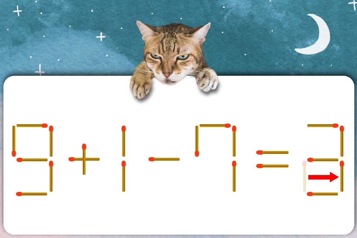 「2」のマッチ棒を1本移動させて「3」を作り、「9+1-7=3」にする。※解答は複数ある場合があります
