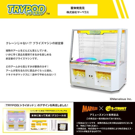 株式会社エス・トラスト(本社:大阪市西区、代表取締役:井田 金吾、以下 エス・トラスト)は、「多彩なエンターテイメントコンテンツ」を「あらゆる事業領域」において「様々なデバイス」向けに展開する、総合エンターテイメント企業 株式会社マーベラスとの契約によりアミューズメント専用景品(プライズ)「レインボーに光る!TRYPODミニフィギュア」を2025年10月5週より全国のゲームセンター・オンラインクレーンゲームへ順次投入いたします。