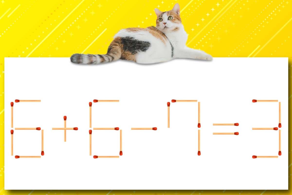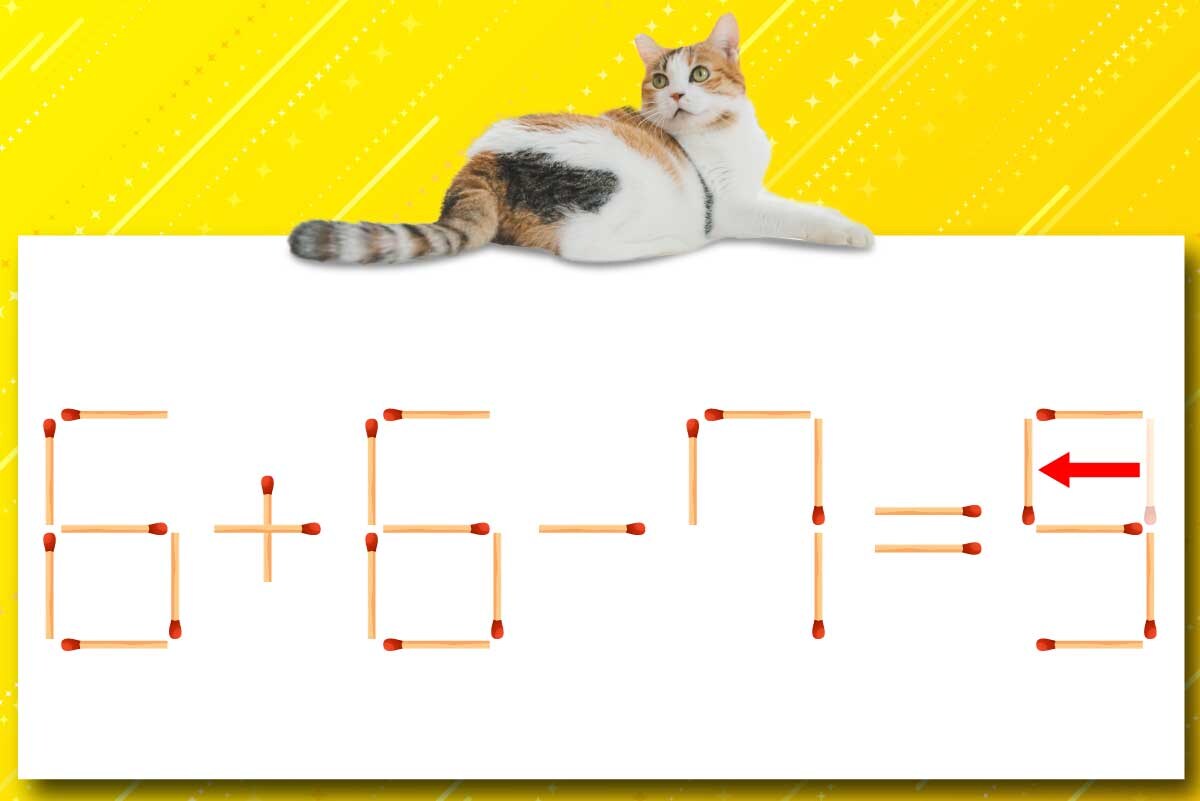 「3」のマッチ棒を1本移動させて「5」を作り、「6+6-7=5」にする。※解答は複数ある場合があります。