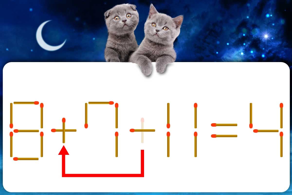 「+」のマッチ棒を1本「-」に移動させて「+」を作り、「8+7-11=4」にする。※解答は複数ある場合があります。