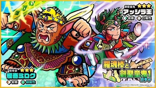 新たな☆3キャラクター「[怪奇姿]怪奇ミロク」と、「[創聖童鬼]アッシラ王」が登場する、「羅魂棒と創聖童鬼1ガチャ」を開始いたしました。