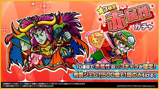 1.5周年記念カウントダウンの一環として、1回限定で、有償ジェム1,500個で回せる「☆3確定 赤属性ガチャ」を開始いたしました。