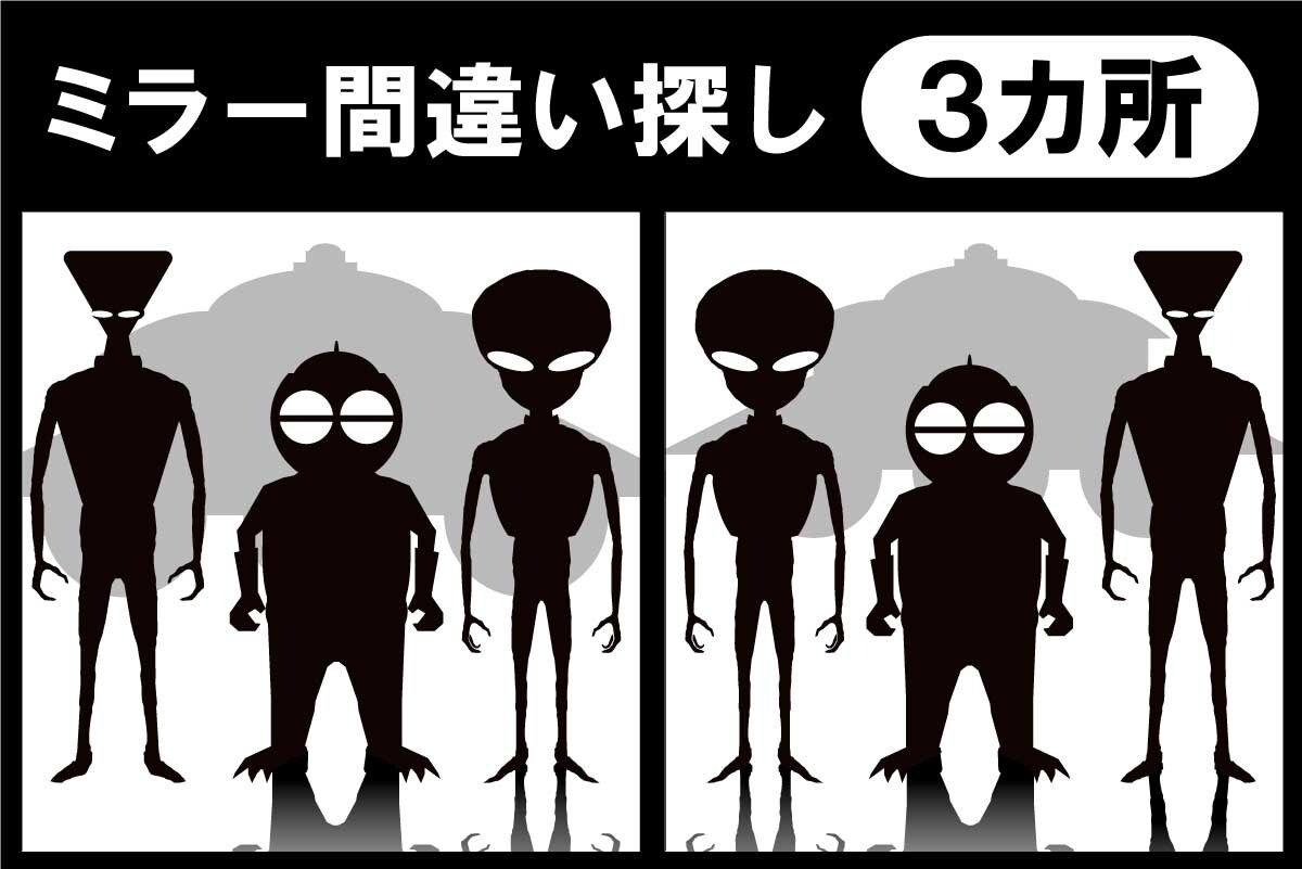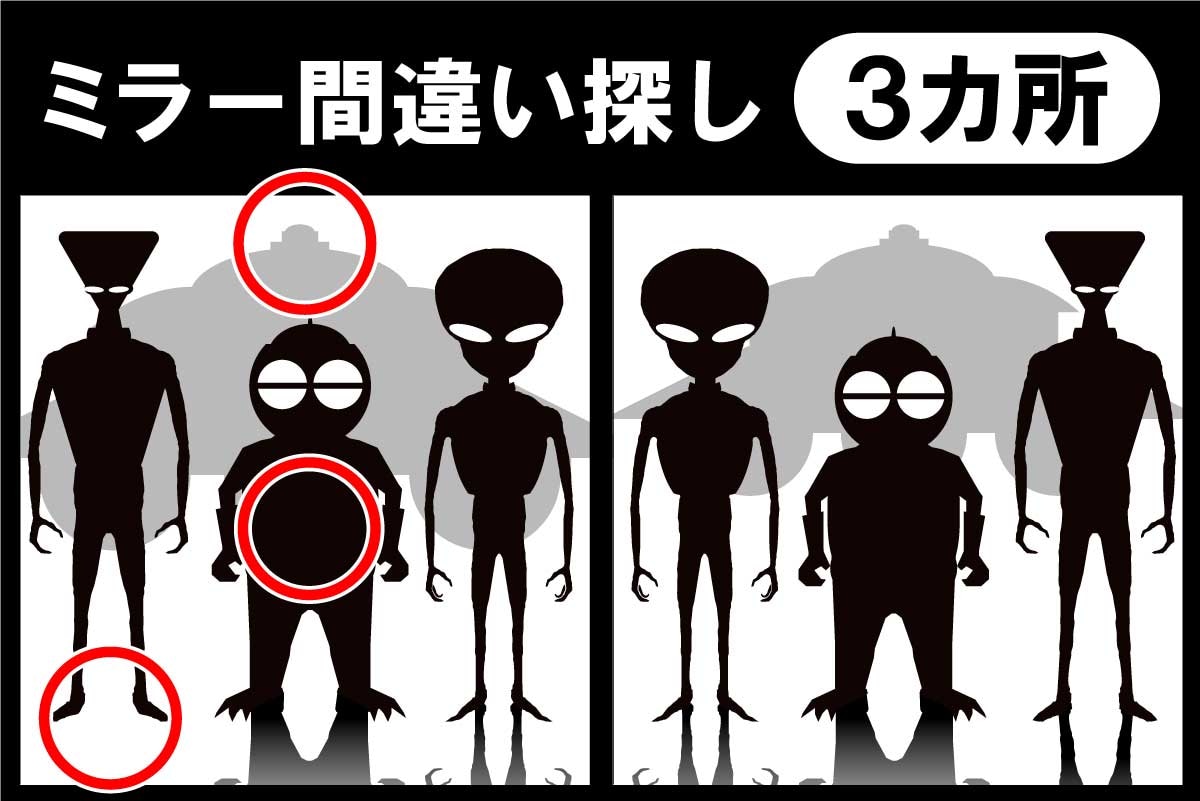 3カ所の違いは、1.後ろのUFOの大きさ、2.中央の宇宙人の大きさ、3.宇宙人の影の数