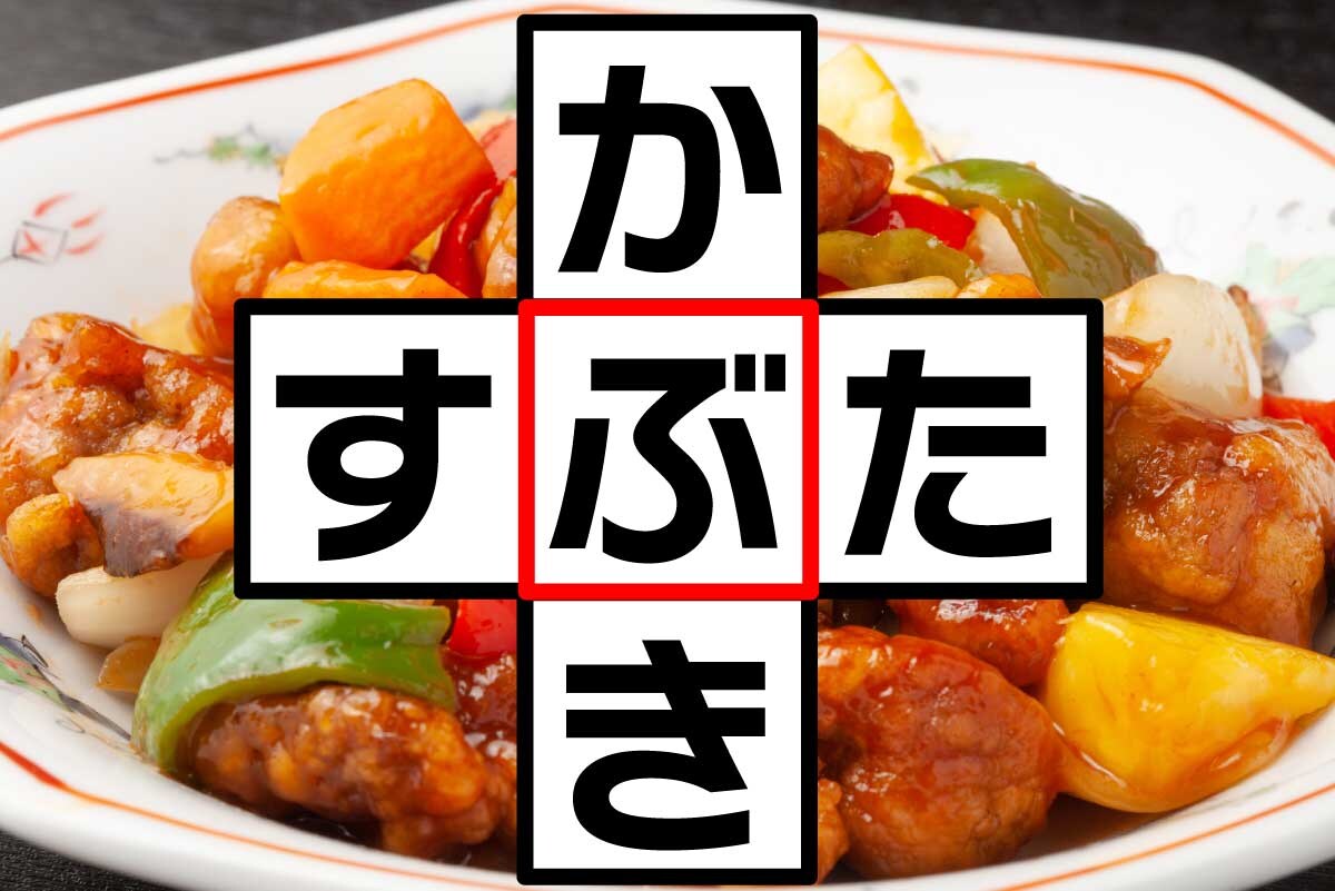 【問題】空欄に入るひらがなは? 【ヒント】タテ:日本の演劇で、伝統芸能の一つ。 ヨコ:下味をつけた角切りの豚肉を用い、衣をつけて油で揚げ、甘酢あんをからませた中華料理。