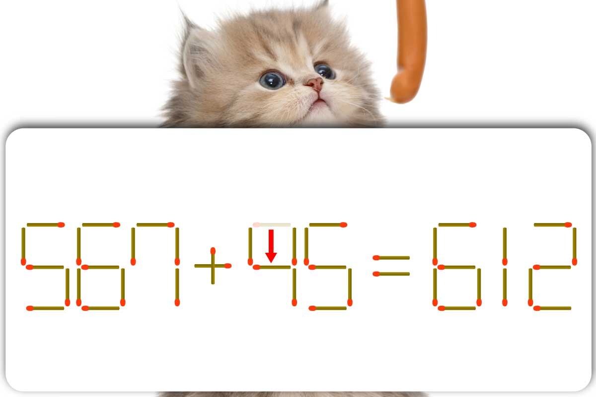 まずは「75」の「7」に注目。真ん中上のマッチ棒をそのまま下にスライドすると、「4」にチェンジ! すると「567+45=612」となり正しい式に! ※解答は複数ある場合があります。