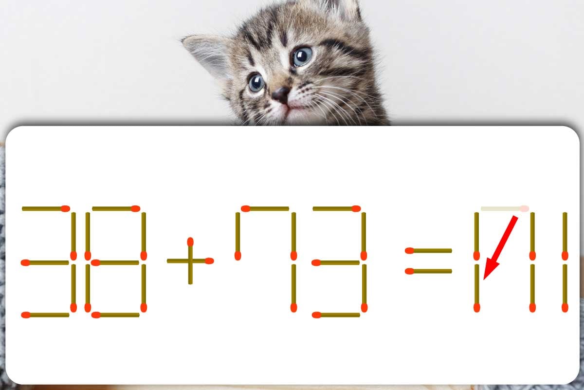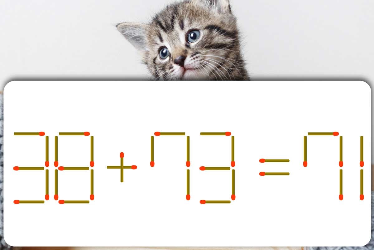 まずは「71」の「7」に注目! 真ん中上のマッチ棒を縦に向きを変えて左下に持っていきましょう。すると「38+73=111」となり、正しい式に! ※解答は複数ある場合があります。