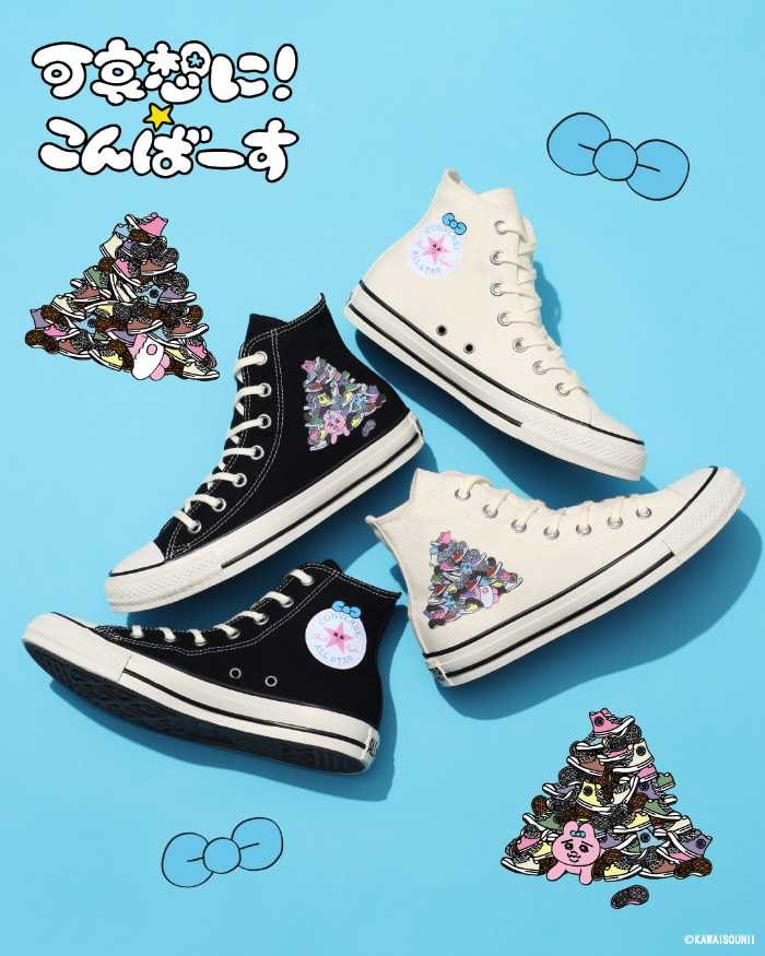 「ALL STAR KM HI / KAWAISOUNI!」は、おぱんちゅうさぎがオールスターに埋もれた描きおろしイラストをアッパーにプリントしたユーモラスな一足。