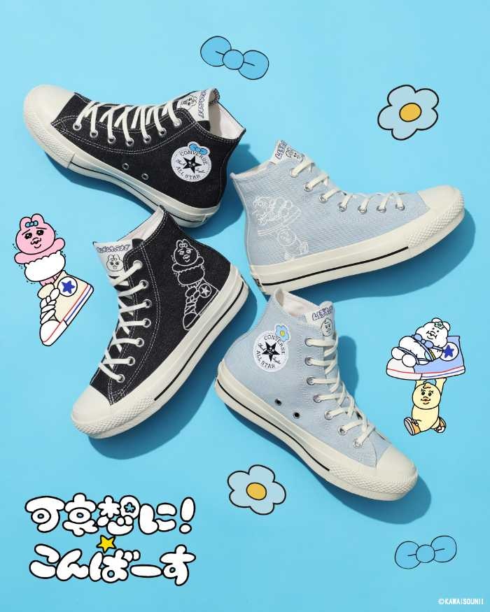 レディース人気の高い「ALL STAR PLTS OG HI / KAWAISOUNI!」は、デニム素材のアッパーに「おぱんちゅうさぎ」と「んぽちゃむ」を刺繍で表現。