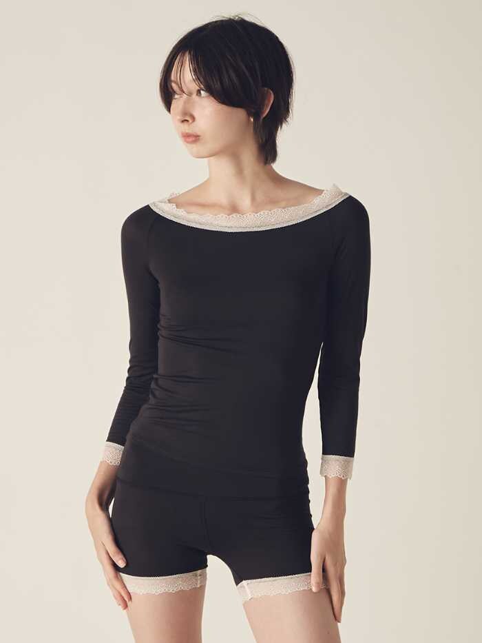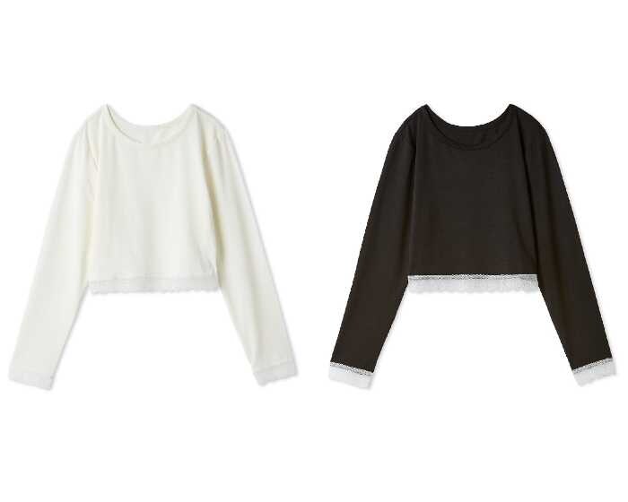 ウエスト部分にレースをあしらったクルーネックタイプは、クロップド丈のトップスとも好相性。袖丈を少し短めに設計することで、洋服から見えにくい工夫もされています。