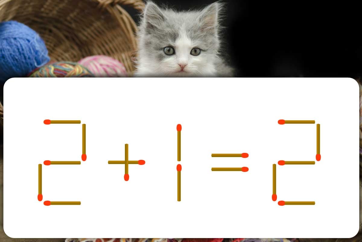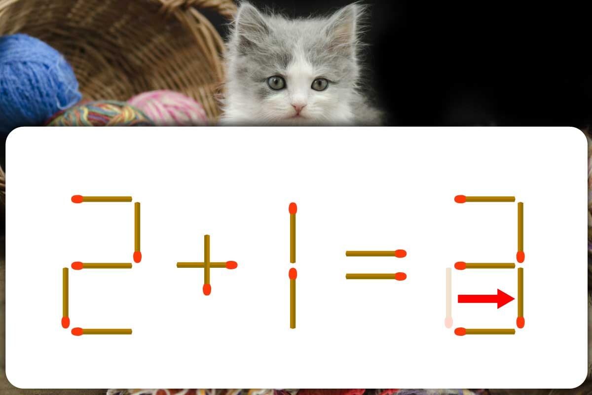 答えの「2」にある左下の縦向きマッチ棒を取ります。そのまま右に動かすと……。数字が「3」になります。これで式は「2+1=3」になり、左右の式の答えが等しくなりましたね♪