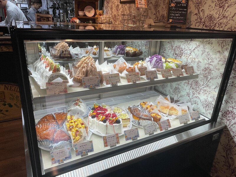 ショーケースの中には、色とりどりの手作りケーキが並びます。季節のフルーツを使ったケーキやキャロットケーキなど、毎日10〜15種類ほどが揃っているのだそう。