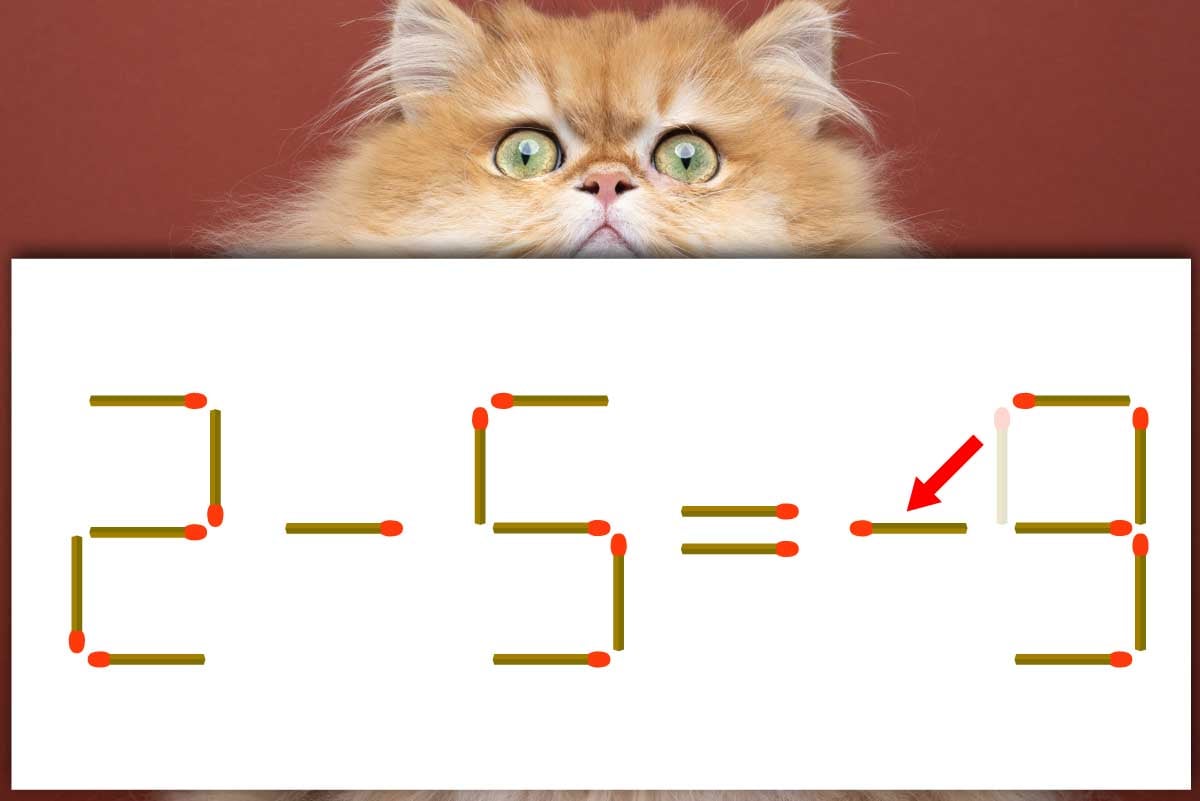 「9」のマッチ棒を1本、「=」の後ろに移動させて「-」を作り、「2-5=-3」にする。※解答は複数ある場合があります。