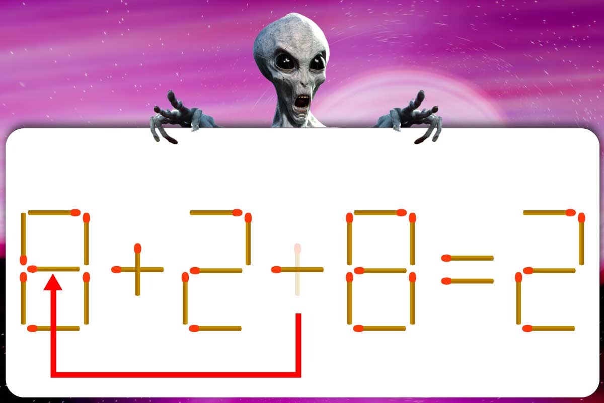 「+」のマッチ棒を1本「0」に移動させて「8」を作り「8+2-8=2」にする。※解答は複数ある場合があります。