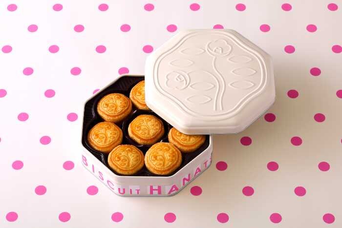 クラシックアイボリーのやわらかい色合いが、口に広がるやさしい甘さと重なります。側面のピンクの「BISCUIT HANATSUBAKI」タイポグラフィが、伝統の中に遊び心を添えています。