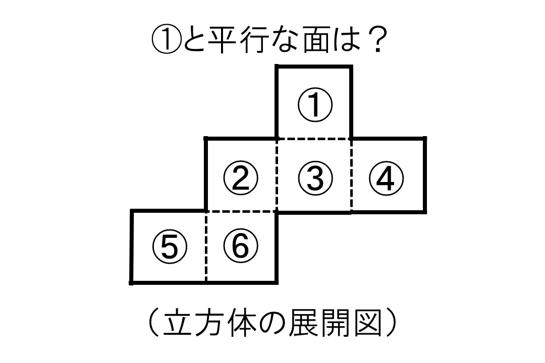 下の図は、サイコロなどでおなじみの立方体の展開図です。この展開図を組み立てた時、①と平行になる面を探してください。論理的な考え方をしてもかまいませんし、展開図を頭の中で組み立てながら考えてもOKです!