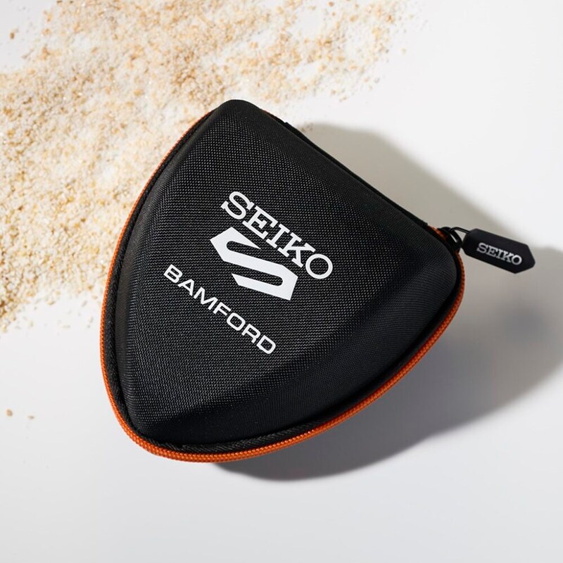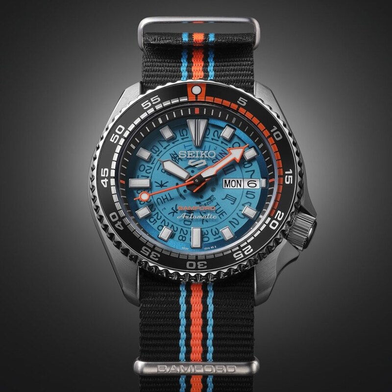 ベゼル表示板は、セイコー 5スポーツのアーカイブデザインを艶感ある素材で再現し、懐かしさと未来感を融合。ダイヤルの6時位置とナイロンストラップの留具には“BAMFORD”ロゴがさりげなくレイアウトされている。