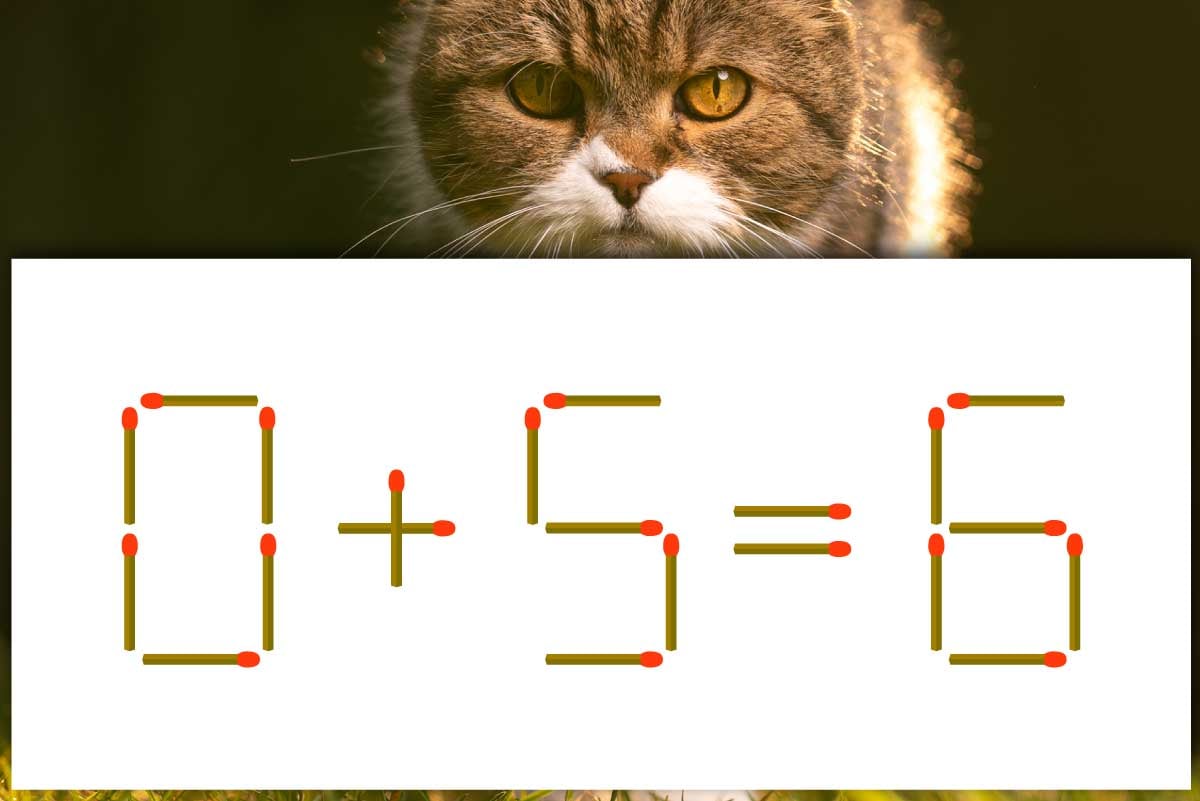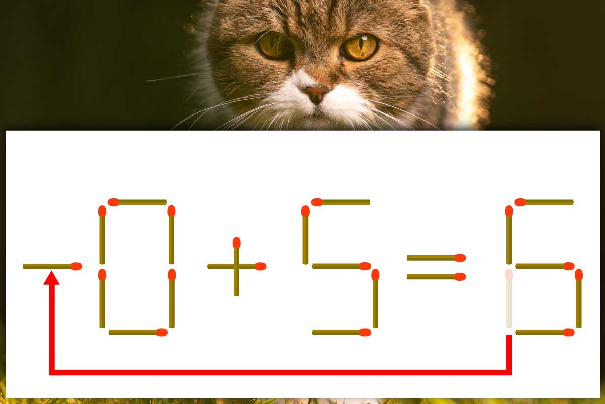 「6」のマッチ棒を1本、「0」の前に移動させて「-」を作り、「-0+5=5」にする。※解答は複数ある場合があります。