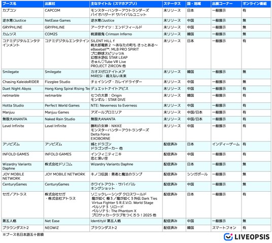 調査内容:公式発表概要や、スマホゲーム出展ブースの展示構成および詳細、TGS2025イベントステージ・公式番組など