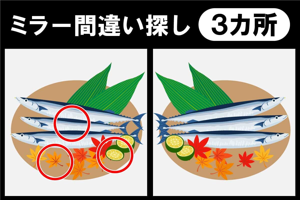 3カ所の違いは、1.真ん中の秋刀魚の大きさ、2.紅葉の色、3.かぼすの向き