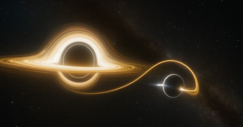このモデルでは、「主役」の超大質量ブラックホール(太陽の180億倍)と、その周りを回る「相棒」のやや小さいブラックホール(太陽の1.5億倍)が12年かけて壮大な軌道ダンスを繰り広げています。