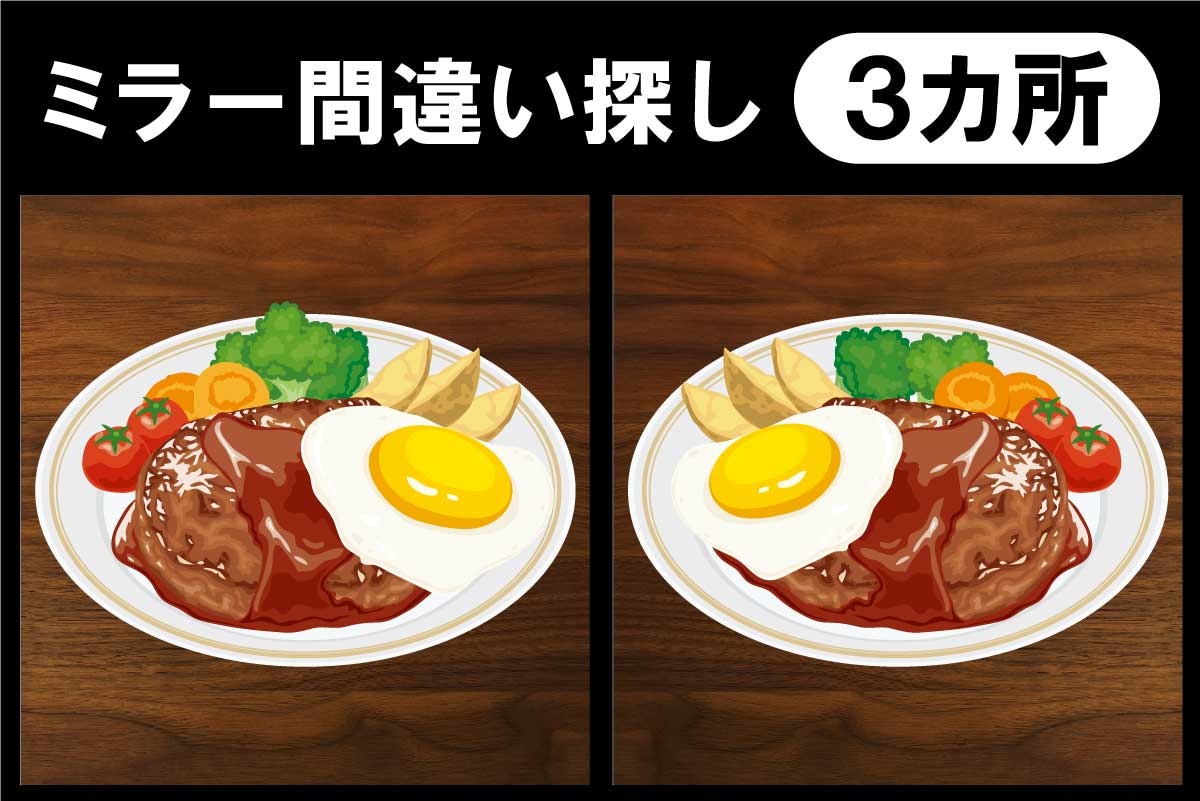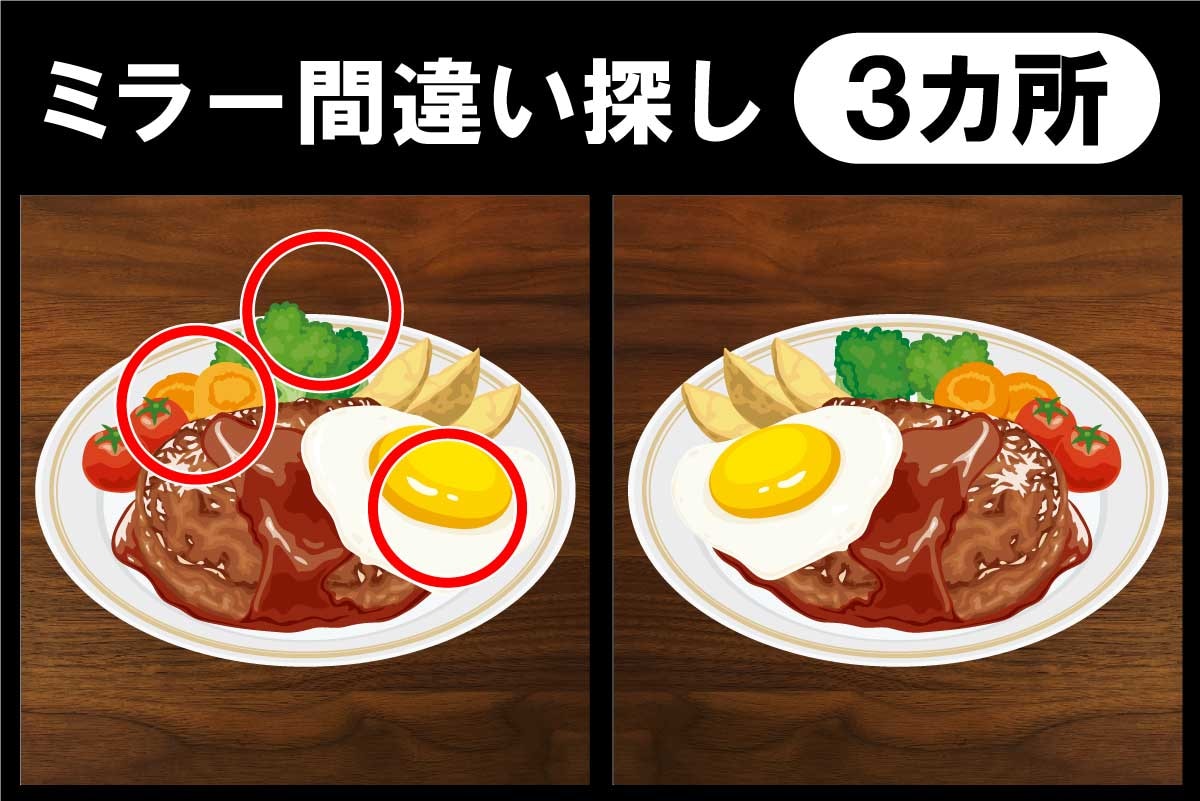 3カ所の違いは、1.ブロッコリーの数、2.ニンジンの色、3.目玉焼きの大きさ