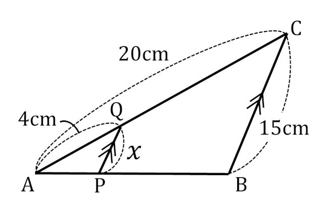 【答】 3cmBCとPQが平行なので、PQ:BC=AQ:ACです。x:15=4:20x:15=1:5x×5=15×1となって、xは3cmと導けます。△APQと△ABCを比べていると考えれば、比の対応関係がわかりやすいですね。