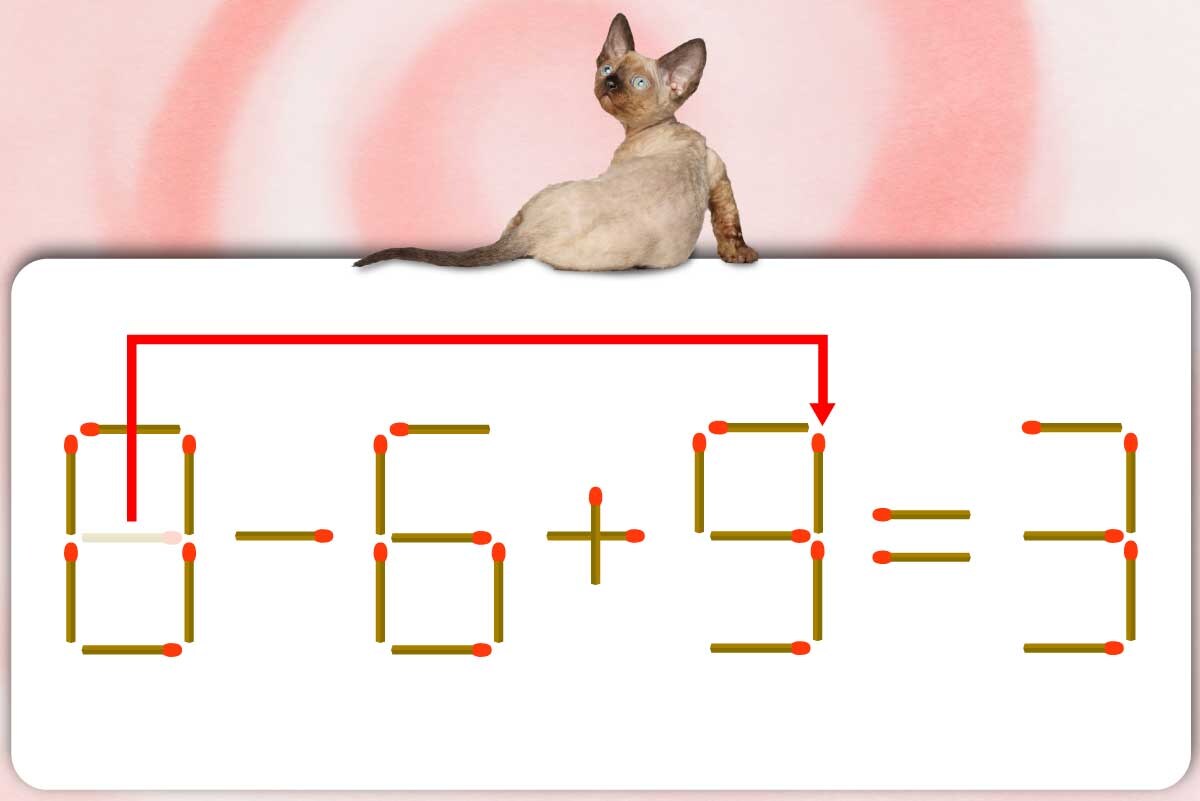 「8」のマッチ棒を1本、「5」に移動させて「9」を作り、「0-6+9=3」にする。※解答は複数ある場合があります。
