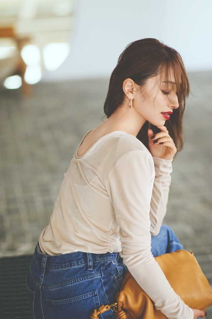 上品な光沢のベロア素材が秋らしい温もりをプラスします。背中の開きも下着が見えないよう調整されており、インでもアウトでも映える優秀デザイン。