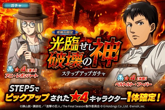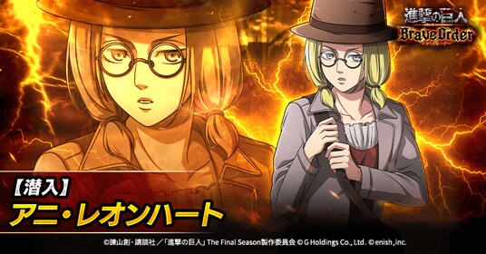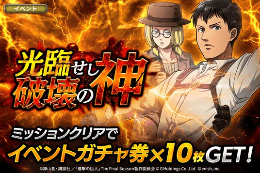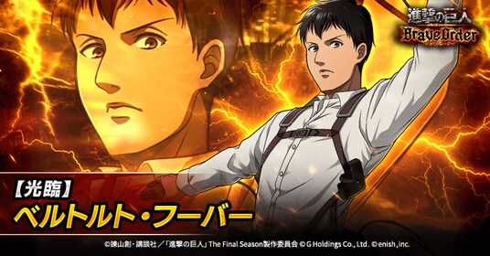 株式会社enish(本社:東京都港区、代表取締役社長:安徳 孝平、以下enish)は、アニメ『進撃の巨人』のスマートフォンゲーム最新作「進撃の巨人Brave Order」にて、2025年10月10日(金)より、新イベントの光臨せし破壊の神を開催!また、本日より【光臨】ベルトルト・フーバー、【潜入】アニ・レオンハートが登場する「光臨せし破壊の神ガチャ」も開催!その他、最新情報はゲーム公式サイト・ゲーム公式X(旧Twitter)アカウントにて随時公開して行きますので、ぜひご覧ください。