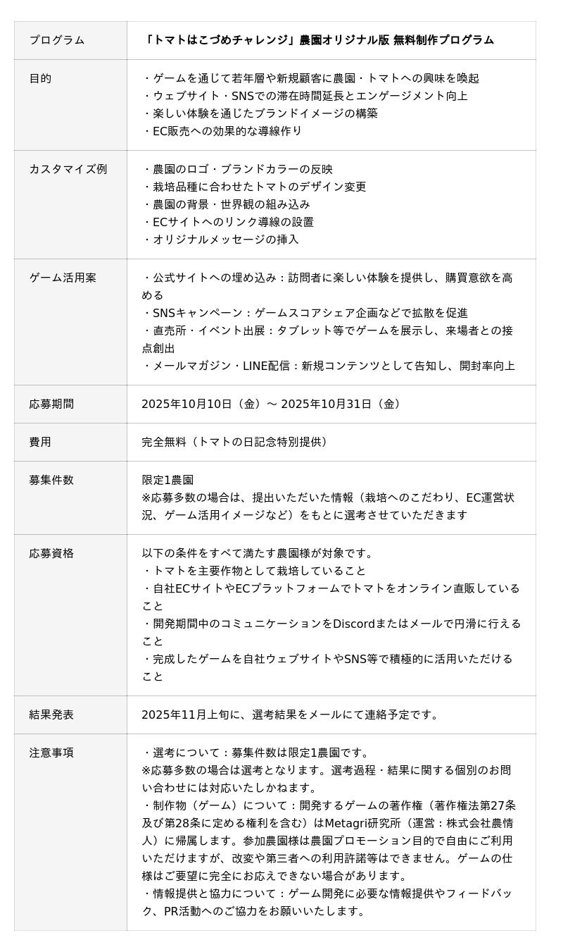 トマトの日を記念して、オンラインでトマトを直販されている農園様限定で、「トマトはこづめチャレンジ」を土台に、農園の特色を反映したオリジナル版ゲームを無料で制作いたします。