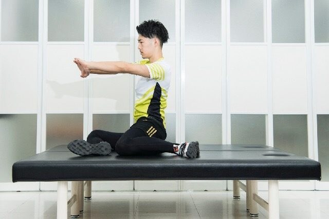 (2)背筋をまっすぐ伸ばし、両腕をまっすぐ前に伸ばして指を絡める