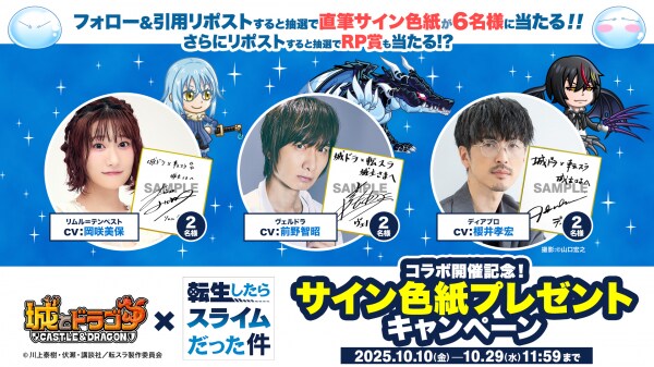 コラボ開催を記念して、「コラボ開催記念!サイン色紙プレゼントキャンペーン」を実施します。『城とドラゴン』公式Xアカウント(@shirotodoragon)をフォローし、キャンペーン対象ポストを公式リポスト、またはハッシュタグ「#城ドラ転スラコラボ」をつけて引用リポストされた方の中から抽選で各賞品をプレゼント!ぜひ引用リポストする際はハッシュタグとあわせて、「コラボイベントが発表された時の感想」や「コラボイベントの楽しみにしているポイント」などもコメントしてみてください!