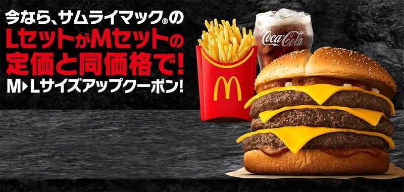 公式アプリで、「サムライマック」MセットからLセットへのサイズアップクーポンを配布中。
