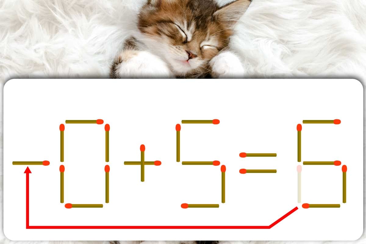 「6」のマッチ棒を1本「0」の前に移動させて「-」を作り、「-0+5=5」にする。※解答は複数ある場合があります。