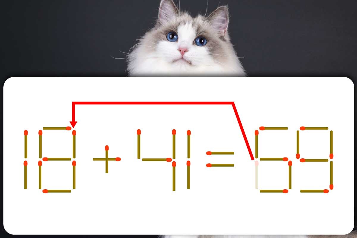 右側の答えの「69」を見てみましょう。ここから「6」の左下にある縦向きのマッチ棒を1本取ると「5」に変化。「59」とちょうど「10」減らせました!十の位は合ったので、仕上げに一の位を整えます。取ったマッチ棒を、式の「16」にある「6」の右上に加え「8」にしましょう。すると「18+41=59」となり、両辺の値が一致する式ができました♪