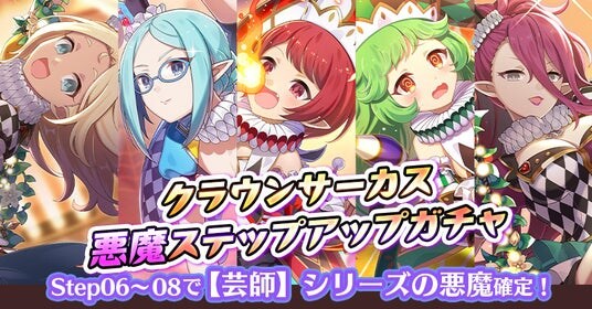サーカス衣装の5悪魔が描かれた、【芸師】シリーズの使い魔がそれぞれ登場するガチャを販売中です。