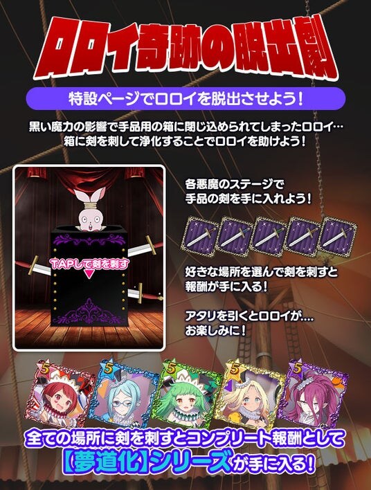 イベントの特設ページにて、イベントアイテム「手品の剣」を使って箱に剣を刺すと、報酬アイテムを獲得することができます。