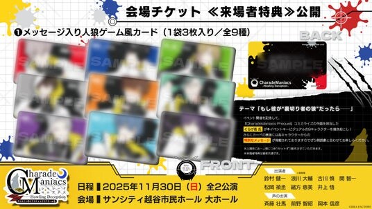 アイディアファクトリー株式会社(代表取締役社長:佐藤 嘉晃/所在地:東京都豊島区)の女性向けゲームブランド「オトメイト」は、2025年11月30日(日)にサンシティ越谷市民ホール 大ホールにて開催する、オトメイトドラマティックシアターvol.05「CharadeManiacs -Howling Deception-」の会場チケット特典の詳細を公開いたしました。