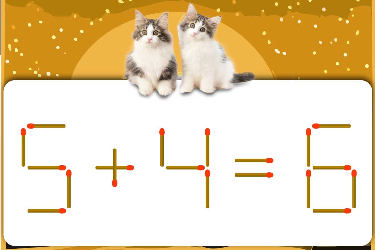 答えの「6」から、左下にある縦のマッチ棒を取ります。そのまま右上にマッチ棒をくっつけてみると、数字が「9」にひっくり返りましたね♪これにより式が「5+4=9」となり、キレイに式が完成します!
