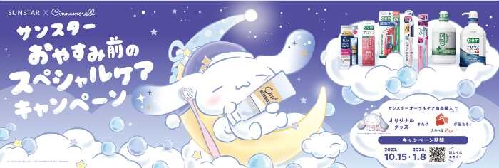 サンスターが「おやすみ前のスペシャルケアキャンペーン」を実施♡期間中に対象のオーラルケア製品を購入すると、サンリオ人気キャラクター・シナモロールとのコラボグッズや、「えらべるPay®」が抽選で当たります。就寝前の丁寧な歯みがきや歯間ケア、マウスウォッシュを取り入れて、翌朝の口内スッキリ&心地よいリラックスタイムを楽しめます。