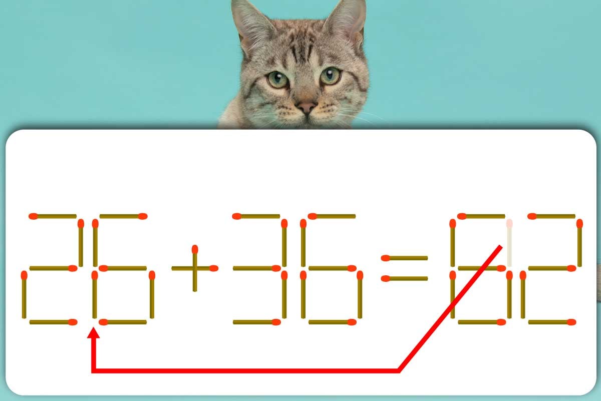 答えの「82」から「8」の右上にある縦向きマッチ棒を1本取ることで「6」となるため、数字を「62」に減らすことができます。そして左の「25」にある「5」の左下に予定通りマッチ棒を加え、「6」にして「26」に。どちらの数字も「6」に変化することで、「26+36=62」という正しい計算式ができました!