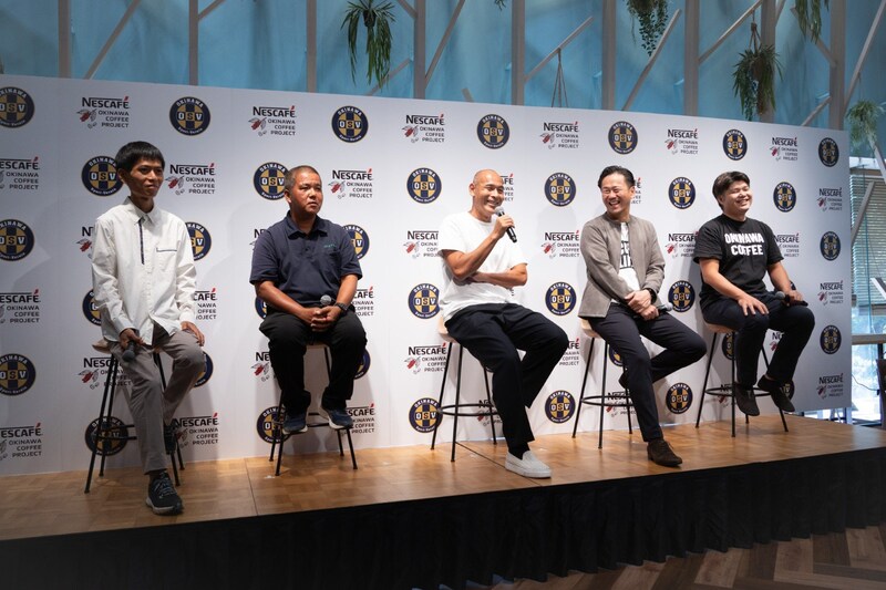 登壇したのは、ネスレ日本の深谷社長、現地で栽培支援を行う一色さん、沖縄SV代表の髙原さん、協力農家の又吉さん、宮平さんの5人。
