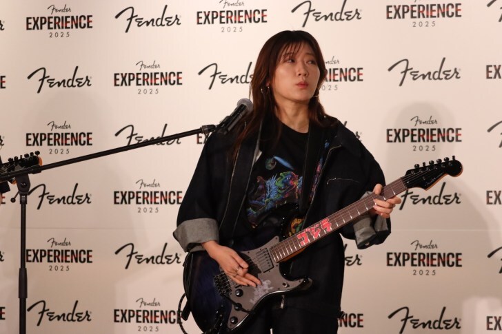 普段はアコースティックギターを愛用しているとのことで、Fenderのエレキギターを手にすると「持つのもかっこいいし、弾き心地も滑らかで気持ちいいですよ」と話した。
