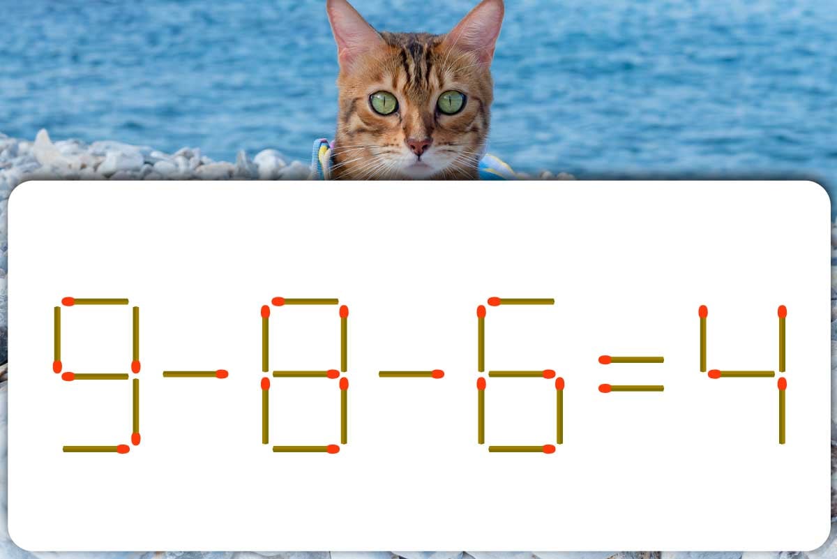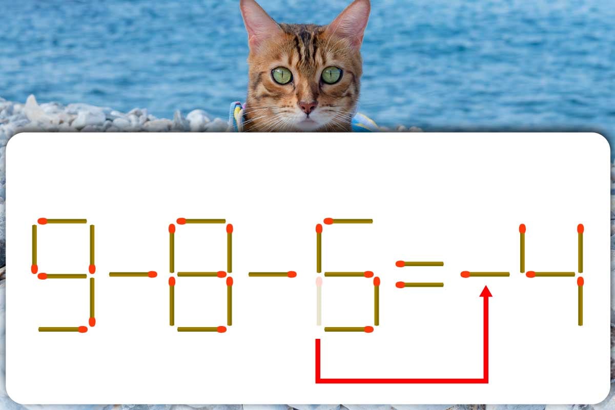 「6」のマッチ棒を1本、「=」の後ろに移動させて「-」を作り「9−8−5=−4」にする。※解答は複数ある場合があります。