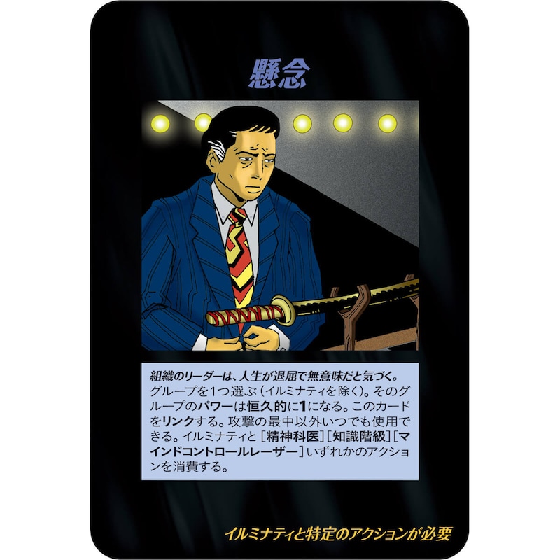 まずは上の「懸念」というタイトルのカードを見てほしい。絵柄に描かれているのは、前髪や側頭部に白髪を生やしたスーツ姿の男性。カードの説明文には「組織のリーダー」とある。どこか思い詰めたような表情で、その視線の先には日本刀が置かれているのだ。いやはや、見覚えある人物に酷似していないだろうか─。